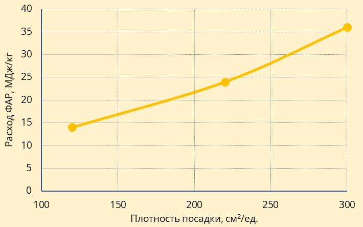 При плотности посадки 220 см2/ед. выход биомассы сократился на 20%, а расход ФАР сократися на 10%, составив 21,9 МДж/кг против 24,2 МДж/кг. Уменьшение плотности посадки растений улучшает взаимодействие растений и светового потока, направленного в горизонтальном направлении по отношению к поверхности земли.