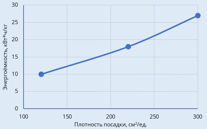 Энергоёмкость сырой биомассы салата практически не зависела от светорапределения светового потока в пространстве при обоих значениях плотности посадки. При плотности посадки 120 см2/ед. энергоёмкость биомассы оказалась на уровне 11 кВт*ч/кг, при плотности посадки 220 см2/ед. — 18 кВт*ч/кг.
